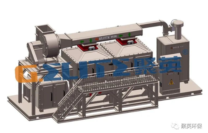 由環(huán)保離心風機將大風量、低濃度有機廢氣吸入沸石吸附床,在吸附床內與多層蜂窩狀沸石充分凈化(吸附),沸石內部逐漸富集濃縮大量有機廢物,而潔凈的氣體則排入大氣;通過燃燒裝置產生的高溫氣體經換熱之后通入活性炭吸附床,使內部有機廢物300-500℃高溫氣化從活性炭孔隙中逸散而出,此時的廢氣濃度遠遠高于初始吸附的廢氣濃度,然后進入催化燃燒裝置(350℃)進行氧化分解成CO 和H O等無害氣體,氣體經由熱交換器將熱量傳遞再次用于脫附,排入大氣,以此完成一整套凈化流程。