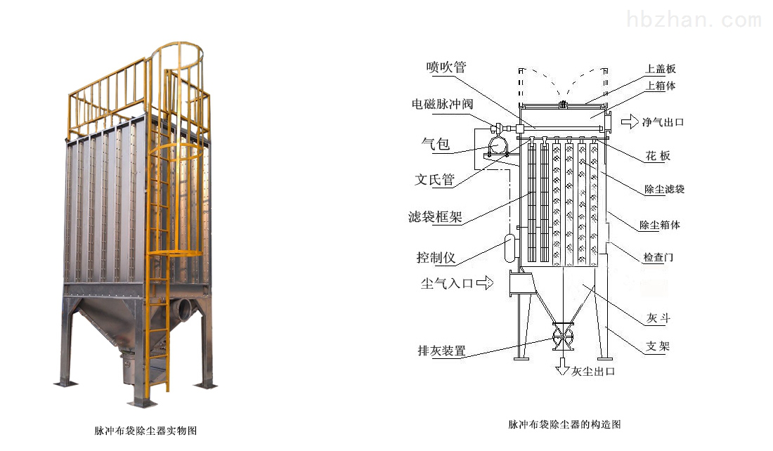 含塵氣體從下開式法蘭進入過濾室,粗顆粒直接落入灰倉,含塵氣體經(jīng)濾袋過濾,粉塵停留在布袋表面。潔凈氣體通過袋口進入潔凈氣室,由風(fēng)機排入大氣。當(dāng)濾袋表面灰塵不斷增加時,程控儀表開始工作。逐個打開脈沖閥,使壓縮空氣通過噴嘴噴出,清洗濾袋,使濾袋突然膨脹。在反向氣流的作用下,布袋表面的粉塵迅速從濾袋中分離出來,落入灰倉,由排灰閥排出。