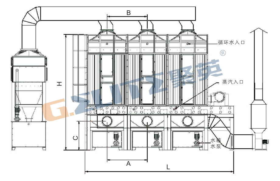 在環保離心風機的抽吸作用下油煙塵空氣從塵源經管道進入濕電油煙塵凈化器,油煙塵顆粒進入高壓電離區域,通過高頻電源放電對油煙塵顆粒進行電離分解,超細微粒煙塵被高壓擊穿形成正負離子,然后流經靜電電場被靜電吸附捕捉,達到凈化的目的。