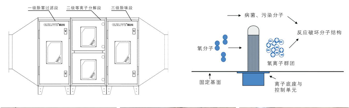 低溫等離子體”是電子、化學、催化等綜合作用下的電化學過程,是依靠等離子體在瞬間產生的強大電場能量電離、裂解有害氣體的化學鍵能,從而破壞廢氣分子結構,達到凈化目的。